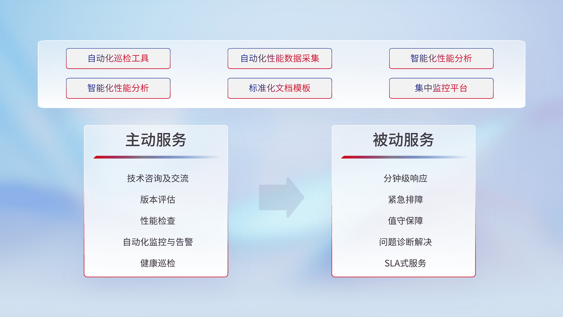 智能化工具和标准化文档,,,,保障服务质量,,,,提供主动服务(包含技术咨询、、版本评估、、、、性能检查、、、自动化监控与告警、、健康巡检)和被动服务包含(分钟级响应、、紧急排障、、、值守保障、、、、问题诊断解决、、SLA服务)。。。。